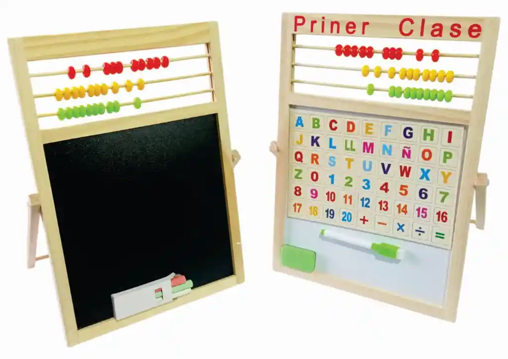 Tablero Didáctico Doble cara para niños (Multipropósito: tiza y acrílico) Tizas, marcador y borrador Tabla con el abecedario (A-Z), números del (0-20) y signos de operaciones básicas(+=×÷ó). Cada uno de ellos esta imantado 1. Material estructura: Madera. 2. Producto apto para niños mayores de 3 años. 3. Este tablero ayudará a sus hijos a mejorar su capacidad de coordinación y aprendizaje. 4. Este tablero permitirá a sus hijos jugar mientras aprenden. 5. El tablero cuenta con soporte plegable para sostenerse por sí mismo. 6. Tiene soportes plásticos para protección inferior de la estructura 7. Tienen marcador acrílico y tizas para escribir o dibujar lo que desees 8. Espectacular tablero 2 en 1 9. Es plegable para fácil guardado 10. Excelente para la creatividad de tus hijos