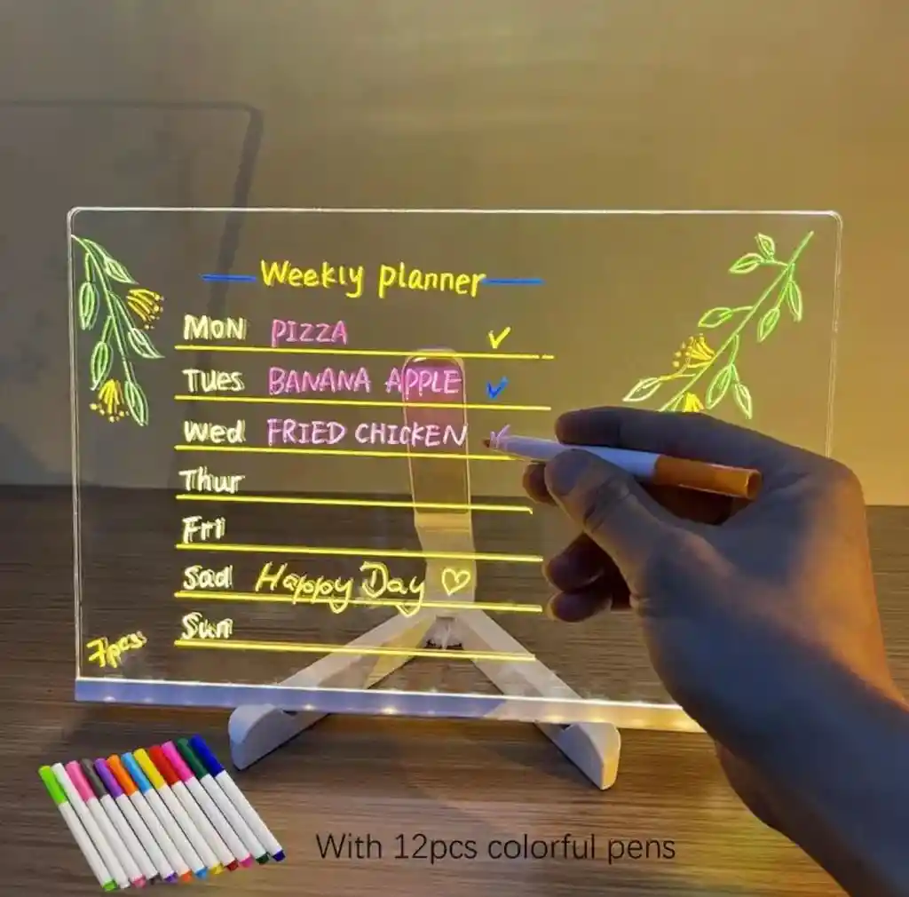 Tablero de mensajes LED con marcadores de 7 colores, tablero de dibujo acrílico que brilla en la oscuridad, superficie de borrado en seco iluminada con alimentación USB, con soporte para oficina, escuela, decoración del hogar.