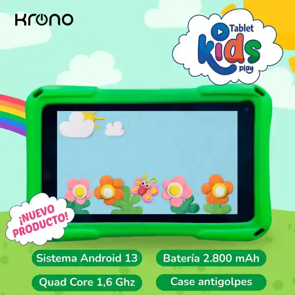 Diseñado para resistir golpes y caídas, ideal para el uso diario de los niños Un toque de color, diversión y alegría con los pines decorativos. Diseños pensados para hacer la Tablet aún más especial. Además, cuenta con un soporte trasero que hace más cómodo jugar, ver videos o aprender en cualquier lugar. Con 6GB de memoria RAM (3GB + 3GB extendida) y 32GB de memoria interna, los niños pueden jugar, ver videos, aprender y explorar sin interrupciones. Hay espacio de sobra para sus apps favoritas, dibujos, fotos y mucho más. Con su cámara frontal de 0.3MP y la trasera de 2.0MP los niños podrán capturar sus momentos favoritos, hacer videollamadas con la familia o tomar divertidas fotos para guardar sus recuerdos. Nada como saber que la diversión seguirá sin pausas. La batería de 2800 mAh le da a los pequeños la libertad de disfrutar su Tablet donde quieran, cuando quieran, y por mucho más tiempo.