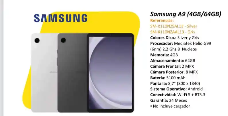 Colores Disp.: Silver y Gris Procesador: Mediatek Helio G99 (6nm) 2.2 Ghz 8 Nucleos Memoria: 4GB Almacenamiento: 64GB Cámara Frontal: 2 MPX Cámara Posterior: 8 MPX Batería: 5100 mAh Pantalla: 8,7” (800 x 1340) Sistema Operativo: Android Conectividad: Wi-Fi 5 + BT5.3 Garantía: 24 Meses ▪ No incluye cargador EXPOTECNOLOGIA 3505945136