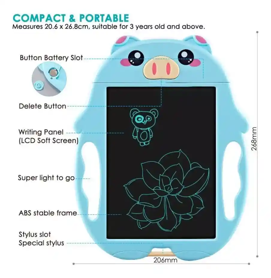 Producto: pizarra infantil LCD Sobre ese producto: tablero de dibujo LCD que protege los ojos, hecho de una pantalla LCD no luminosa, sin luz azul, sin daño a la vista, puede restaurar la realidad del papel, como dibujar sobre papel. Debido al diseño del sensor de presión, las diferentes presiones de la punta del bolígrafo proporcionarán diferentes líneas (delgadas o gruesas). Durabilidad y buena artesanía-La carcasa está hecha de material ABS de alta resistencia, que es ligero en peso pero duradero. La superficie lisa y libre de rebabas puede proteger eficazmente la delicada piel de los bebés de arañazos y es segura de usar. Fácil de limpiar, simplemente presiona la nariz para quitar el graffiti, para que los niños puedan crear libremente, pero elimina el desperdicio de papel, energía y respeto al medio ambiente. la naturaleza de los niños, animarlos a crear e imaginar, estimular sus habilidades de pintura, y proteger en gran medida las paredes y muebles de la pintura. Tamaño compacto y portátil 20.6x26,8cm, adecuado para niños de 3 años y más. Tamaño ligero y compacto, fácil de transportar. Hay dos asas en el lateral para que los niños puedan agarrar fácilmente. Característica: Uso de pantalla de cristal líquido no luminoso de alta calidad, sin luz azul, sin daño a la vista Desarrollar habilidades de dibujo y boceto de los niños, así como la capacidad cognitiva de la ubicación espacial Liberar la naturaleza de los niños. y estimular su creatividad e imaginación Limpieza y reciclaje con un solo clic, eliminando el diseño del sensor de presión Stroke papel residual, diferentes presiones proporcionan diferentes efectos Equipado con dos plumas de dibujo (uno está instalado en el tablero de escritura en la parte inferior como un bolígrafo de repuesto) La superficie lisa No tiene rebabas y esquinas redondeadas, lo que puede proteger las manos de los niños lindo Cerdo de dibujos animados, a tus hijos les encantará. Tamaño ligero y compacto para facilitar la portabilidad. Especificación: Tipo de proyecto: tablero de escritura LCD para niños Fuente de alimentación (bolígrafo): batería de 1 botón (incluida) Material: plástico ABS. Tamaño del producto: 20,6 x 26,8 cm Edad recomendada: más de 3 años Color: rosa, azul, beige (opcional, puede ponerse en contacto conmigo) El paquete incluye: 1 tablero de escritura LCD con 2 bolígrafos.