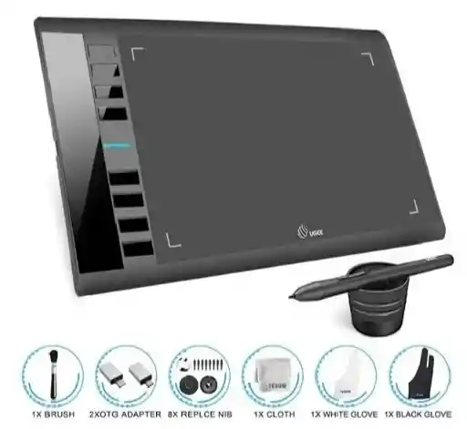 UGEE M708 tableta de dibujo gráfico Tablet de dibujo gráfico M708 UGEE de 10.0 x 6.0 in de área activa grande con 8 teclas de acceso rápido, bolígrafo de 8192 niveles, con superficie de textura de papel, proporciona un dibujo enorme y suave para su creación de ilustraciones digitales, ofrece experiencia de pintura sin retrasos para pintar arte digital. La tableta gráfica Ugee M708 es una tableta de dibujo fácil de usar. No solo para artistas y diseñadores, sino para estudiantes y niños. Práctico y portátil. Características: Gran área activa, gran experiencia de dibujo Área activa grande de 10.0 in x 6.0 in con superficie lisa de textura de papel, esta tableta de dibujo digital no solo te proporciona suficiente área de trabajo, sino también con una maravillosa experiencia de dibujo como el papel. Para sus necesidades, mejora la productividad La tableta de arte gráfico viene con 8 teclas de prensa personalizables en el lado izquierdo de la tableta, puede configurar los atajos de acuerdo con su propia preferencia; Equipado con 5080LPI de alta resolución, 266RPS, 8192 niveles de sensibilidad a la presión del lápiz para no retrasar o sin picar excelente experiencia de dibujo. No hay necesidad de preocuparse por la eficiencia de la tableta; ampliamente utilizado para diseñador, artista, profesor, estudiante, personal de oficina, hombre de ventas, presentador, etc. UGEE - Bolígrafo digital El bolígrafo Ugee P01 es un bolígrafo sin batería, equipado con un soporte para bolígrafo que tiene 8 puntas de bolígrafo y 1 herramienta de extracción dentro; 8192 niveles de presión y un interruptor de borrador con un solo clic proporcionan una experiencia sin problemas y eficiente. Parámetros Tecnología: Digitalizador electromagnético Área activa: 10.0 x 6.0 in. Resolución: 5080 LPI (Lines por pulgada) Sensibilidad de la presión: 8192 Niveles Tasa de Informes: Max 266 RPS (revoluciones por segundo) Botones Express: 8 teclas Express: altura de lectura: 0.394 in Precisión: ± 0,01 pulgadas. Voltaje de alimentación: CC 5 V Consumo de energía: 0,5 W Interfaz: Micro USB. Contenido del paquete: 1 tableta gráfica Ugee M708, 1 lápiz P01 de dibujo, 1 cable USB, 1 soporte para bolígrafo (incluye 8 puntas de repuesto, 1 lápiz removedor), 1 guante UGEE antiincrustante (negro), 1 guante de artista TEROW (blanco), 1 paño de limpieza (gris), 1 manual de usuario en inglés.