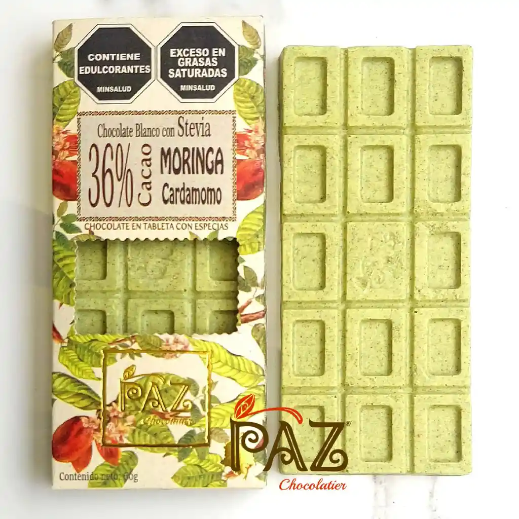 Tableta de chocolate blanco 36% Cacao sin Azúcar, endulzado con maltitol con Moringa, Cardamomo y trocitos de Jengibre.