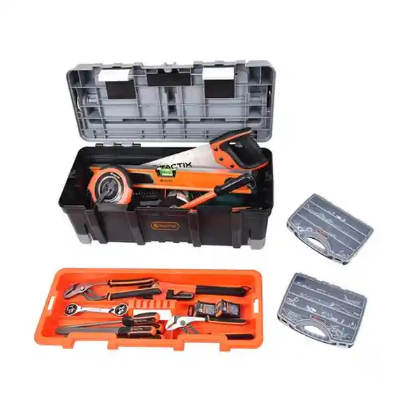Optimiza tu Espacio y Trabaja Como un Experto Con la Caja de Herramientas Tactix de 66.04 cm (26)! Diseñada Con Una Construcción Profesional Que Asegura Una Larga Vida Útil Esta Caja Viene Con Asa de Aluminio Para un Transporte Cómodo y Seguro. Tienes Múltiples Accesorios y Herramientas Pequeñas? Sin Problema! Con Sus Dos Organizadores Extraíbles Encontrarás el Espacio Ideal Para Cada Utensilio. Además Cuenta Con Una Bandeja de Transporte Extraíble Que Hace Aún Más Fácil Mover Tus Utensilios de un Lugar a Otro. Y Para Asegurar la Máxima Protección la Caja Está Equipada Con Cierres de Aluminio Robustos.