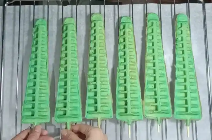 Delicioso waffle esponjoso Lolly Waffle Pops, con suave sabor a vainilla y color verde festivo. Decorado con cubierta de chocolate blanco/negro y toppings que le dan el toque perfecto de dulzura y diversión.