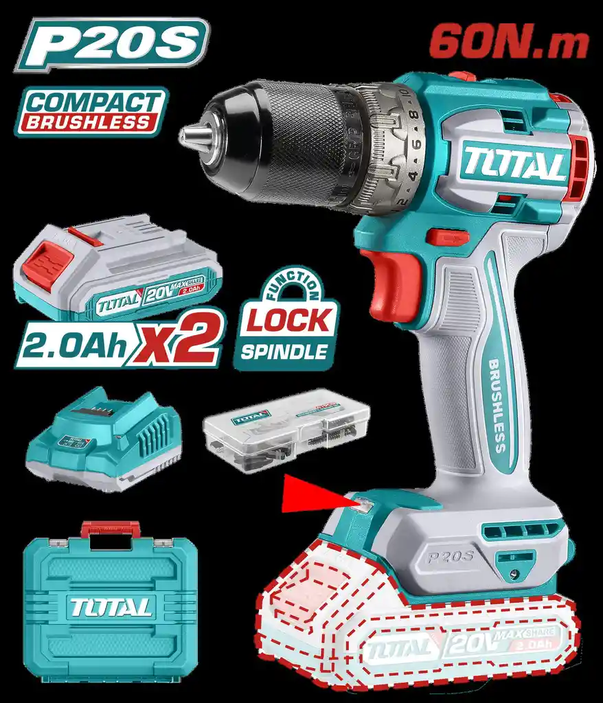 TALADRO DE IMPACTO INALAMBRICO 1/2 20V INCLUYE 2 BATERIA DE 2.0AH, CARGADOR,47 ACCESORIOS,3 BROCAS CONCRETO TOTAL (UTIDLI20602)