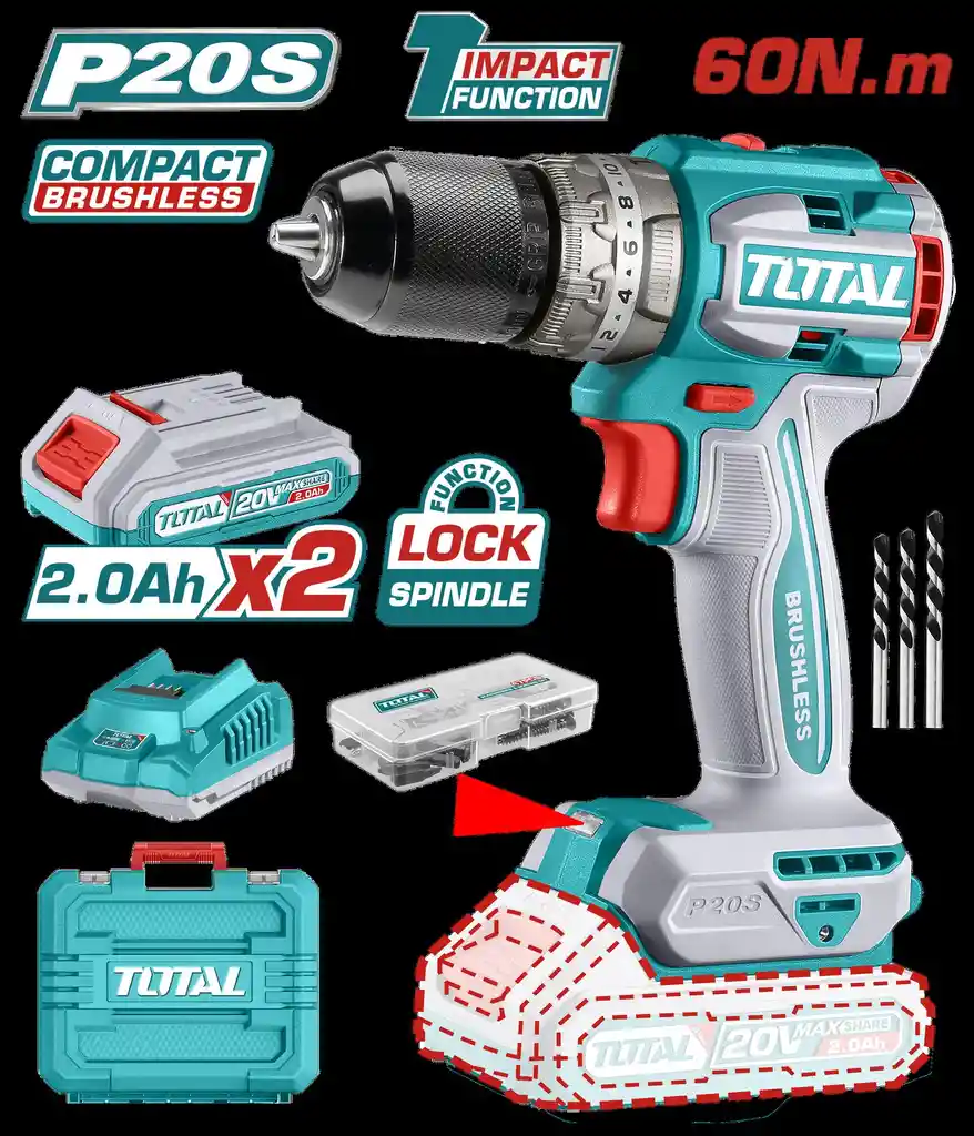 TALADRO DE IMPACTO INALAMBRICO 1/2 20V INCLUYE 2 BATERIA DE 2.0AH, CARGADOR,47 ACCESORIOS,3 BROCAS CONCRETO TOTAL (UTIDLI20602)