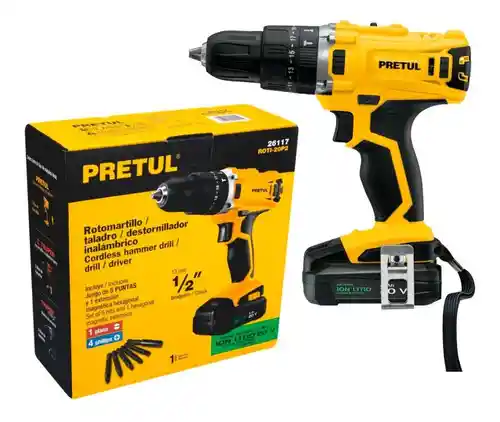 El taladro inalámbrico 1/2 percutor Pretul 20V 26117 es una herramienta versátil diseñada para perforar agujeros en una variedad de materiales y también para funciones de atornillado. Aquí tienes una descripción y algunos usos prácticos: 1. **Potencia y capacidad de percusión**: Con una potencia de 20V, este taladro inalámbrico es lo suficientemente potente como para perforar en materiales como madera, metal y concreto. La función de percusión permite perforar superficies más duras como el concreto con mayor facilidad. 2. **Portabilidad**: Al ser inalámbrico, ofrece la ventaja de la portabilidad, lo que significa que puedes llevarlo a cualquier lugar sin preocuparte por los cables de alimentación. 3. **Mandril de 1/2 pulgada**: El mandril de 1/2 pulgada permite utilizar una variedad de brocas de diferentes tamaños para adaptarse a diferentes tipos de trabajos. 4. **Velocidad variable**: Por lo general, cuenta con una función de velocidad variable que te permite ajustar la velocidad del taladro según el tipo de material que estás perforando o atornillando. 5. **Uso práctico**: Este taladro es ideal para una amplia gama de aplicaciones, incluyendo la instalación de estanterías, montaje de muebles, instalación de accesorios para el hogar, trabajos de carpintería, reparaciones menores y proyectos de construcción. 6. **Batería recargable**: Viene con una batería recargable que te permite utilizar el taladro de manera inalámbrica. Es importante asegurarse de tener una batería cargada para evitar interrupciones durante el trabajo. En resumen, el taladro inalámbrico 1/2 percutor Pretul 20V 26117 es una herramienta poderosa y versátil que puede ser utilizada por aficionados al bricolaje y profesionales para una amplia variedad de tareas de perforación y atornillad