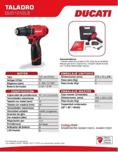 TALADRO INALAMBRICO CON BATERIAS RECARGABLES DE LITIO MARCA DUCATI DUD 1012L Herramientas altamente eficientes garantizando un trabajo excepcional para todos los profesionales. Mundialmente reconocidas por su calidad y alta durabilidad. Marca Ducati. Motor Tipo: Con escobillas Voltaje: 12V Régimen (rpm): 0-350 / 0-1300 Batería (INCLUIDA): Li-ion 1,3 Ah Peso neto: 2,4 Kg Contrucción Capacidad portabrocas (mm): 10 / 0,4 Taladrado en Metal (mm): 10 Taladrado en Madera (mm): 26 Velocidades mecánicas: 2 Velocidad variable: Gatillo progresivo. Indicador de batería: Si Producto nuevo y original con certificado Ducati. SOMOS IMPORTADORES DIRECTOS ENVIOS A TODO EL PAIS
