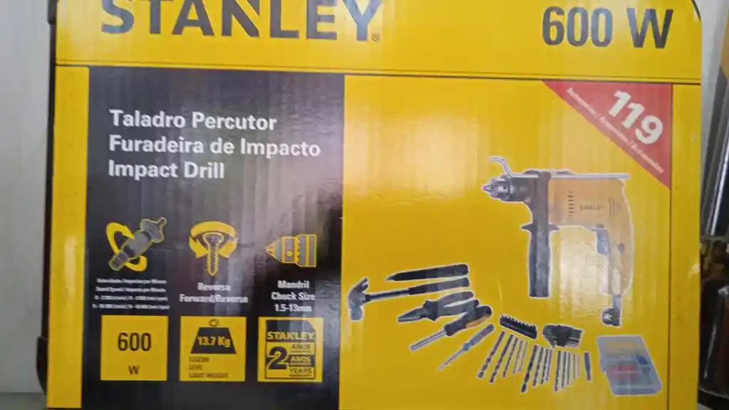 Taladro Stanley percutor de 600w mas 119 accesorios incluye brocas, puntas, martillo, pinzas entre otros