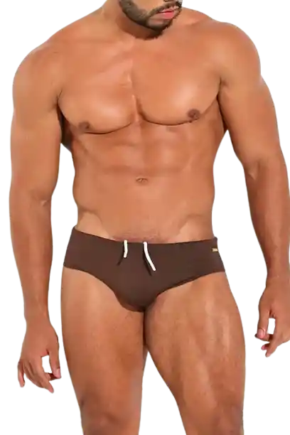 Bañador tipo hilo o brasilera con cintura ajustable, completamente forrado en interior. Su forma se adapta a las formas del cuerpo, dándole un espacio amplio al pene y generando un aumento óptico de tamaño. Este traje de baño para hombre es de talle bajo y ajuste perfecto. Suave y resistente. Es una prenda ideal para el bronceo, permite la movilidad. Ojaletes y placa dorada.Lateral de 3.5 cms.Completamente forrado. Cordón ajustable y punteras.