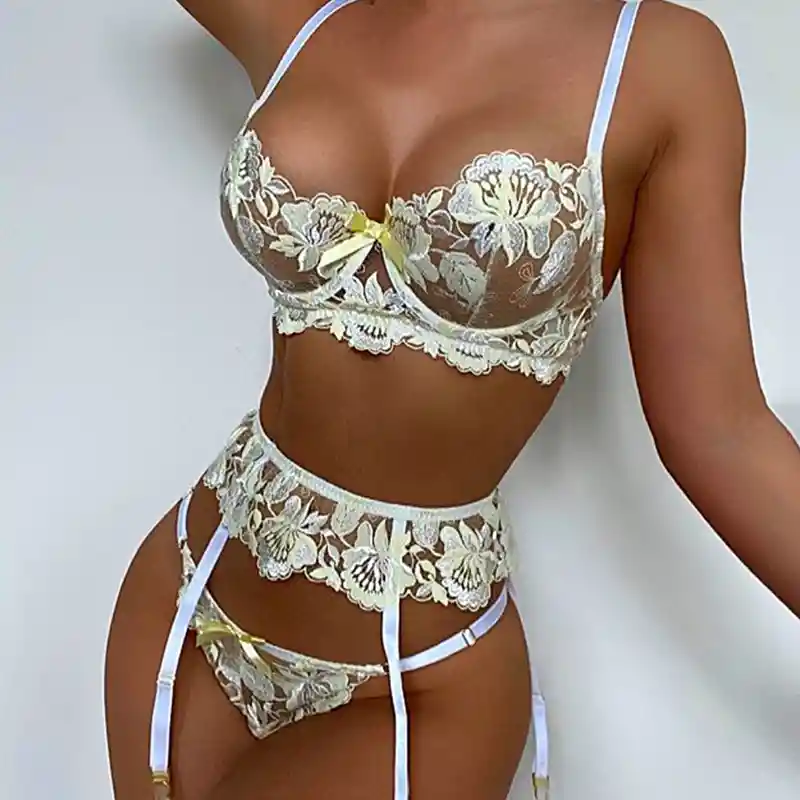 Conjunto de lencería en encaje de 3 piezas - Incluye: brasier con varilla, tanga y liguero - Tallas: S, M y L - Material: tul y encaje Recomendaciones: Lavar a mano, no retorcer, no usar blanqueador, no planchar, evitar el uso de secadora