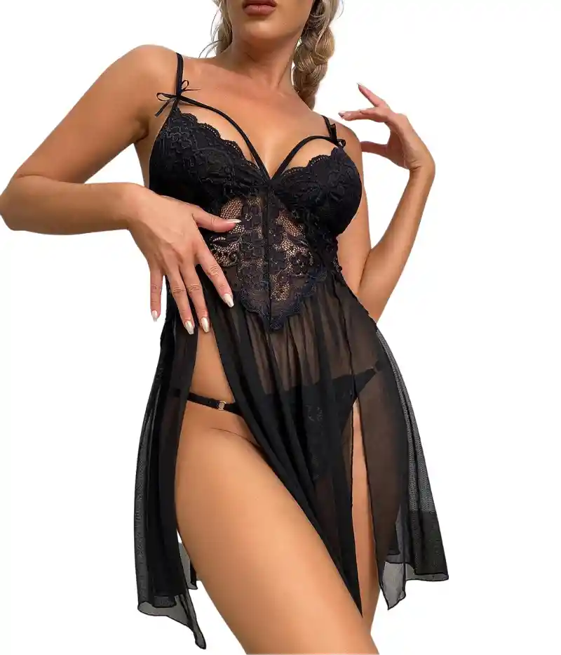Baby doll en encaje y malla de dos piezas. Incluye: baby doll y tanga. -Disponible en color rojo y negro. - Talla M. Recomendaciones: Lavar a mano, no retorcer, no usar blanqueador, no planchar, evitar el uso de secadora.