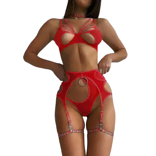 Conjunto de lencería en malla de 3 piezas - Incluye: bralette con varilla, liguero y tanga. - Disponible en color negro y rojo Recomendaciones: Lavar a mano, no retorcer, no usar blanqueador, no planchar, evitar el uso de secadora CONFIDENCIALIDAD: Nuestros envíos son completamente discretos, no tienen logos ni marcas, solo podrás saber lo que contiene el paquete cuando lo abras en su totalidad.