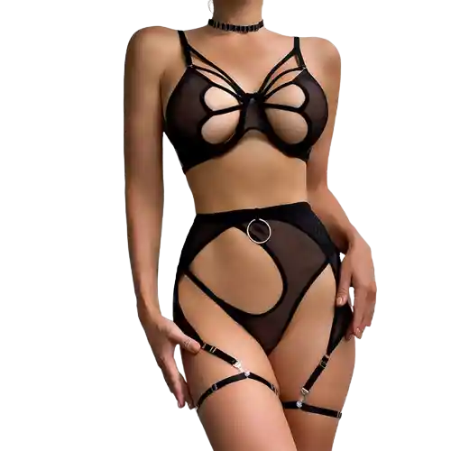 Conjunto de lencería en malla de 3 piezas - Incluye: bralette con varilla, liguero y tanga. - Disponible en color negro y rojo Recomendaciones: Lavar a mano, no retorcer, no usar blanqueador, no planchar, evitar el uso de secadora CONFIDENCIALIDAD: Nuestros envíos son completamente discretos, no tienen logos ni marcas, solo podrás saber lo que contiene el paquete cuando lo abras en su totalidad.