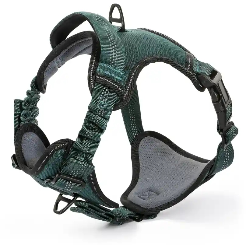 Arnés (sin correa) con amortiguador reforzado proporcionado para los jalones repentinos. Las correas elásticas permiten una gran amortiguación cuando el perro tira y pueden soportar una gran fuerza de tracción para proporcionar protección y aumentar el control."