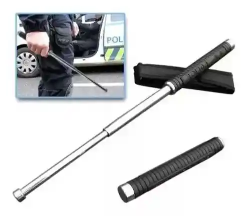 Tambo para defensa personal en acero, plegable (retráctiles) para mayor comodidad al cargarlo, incluyen estuche para llevarlo cómodamente, y cuenta mango en caucho antideslizante. El arma de defensa personal perfecta, ya que su punta pesada aumenta la fuerza del golpe, así como la longitud que provee mayor alcance ante un agresor. De gran utilidad en empresas de seguridad, policías y defensa personal. IMPORTANTE: es completamente normal que el tambo se atasque una vez se abra porque esta es su funcionalidad para que no se cierre mientras se usa. El tambo no se cierra a presión sino mediante un golpe seco contra el suelo o superficie sólida (ver vídeo que se encuentra al final de las fotografías en esta publicación).