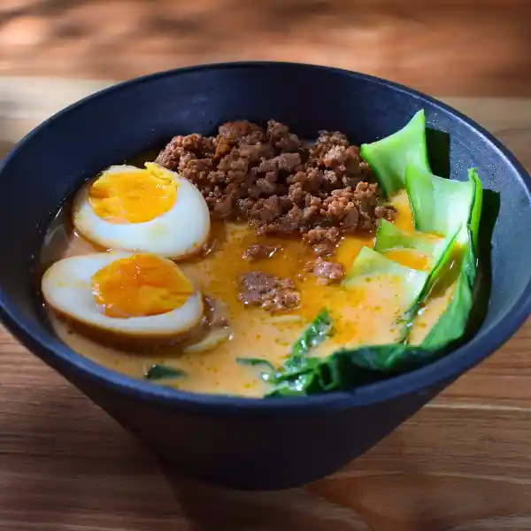 Con Base de fondo de pollo y con leche de soy, thaini, patchoi, huevo, un toque de picante y carne de res molida.