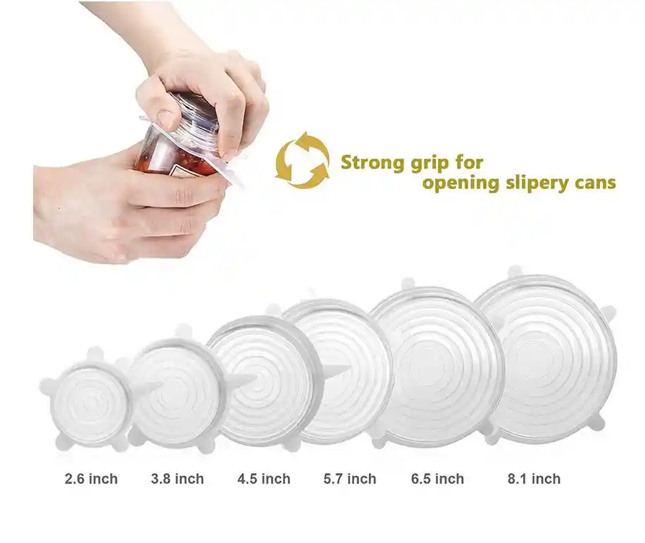 Tapa elástica de Silicona trae 6 piezas de diferente tamaño, reutilizables y resistente al calor, mantiene los alimentos frescos.*********************************************************************************************************************Descripción:- Tipo: Piezas de utensilios - Características: Ecológicos - Utensilios de Cocina: Tipo Tapa - Material: Silicona de grado alimenticio -Temperatura: 40F A+446F( 40c A + 230c)-Material: 100% Silicona de grado alimenticio-Ventaja: Resistente al calor flexible -Tamaño: 65mm, 95mm, 115mm, 145mm, 165mm, 210mm -color: color Blanco y Azul***********************************************************************************************************************Paquete incluyeSet 6 Tapa Elástica de silicona