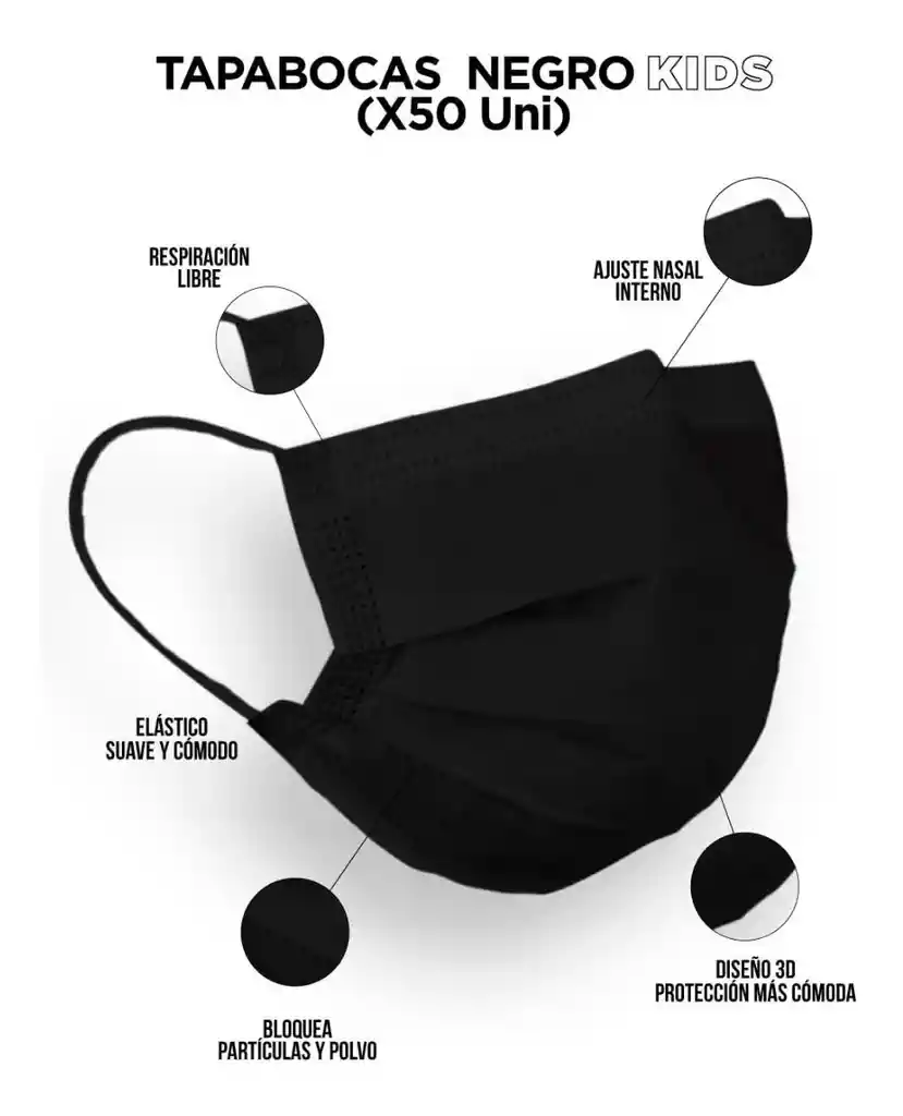 Tapabocas desechables para niño. Cuentan con 3 capas de protección: Capa Exterior: tela quirúrgica Capa mitad: filtro de alta densidad Capa interior: tela quirúrgica absorbente Tienen banda ajustable en la nariz, son suaves con la piel y prácticos de llevar. Transpirables y resistentes al polvo.