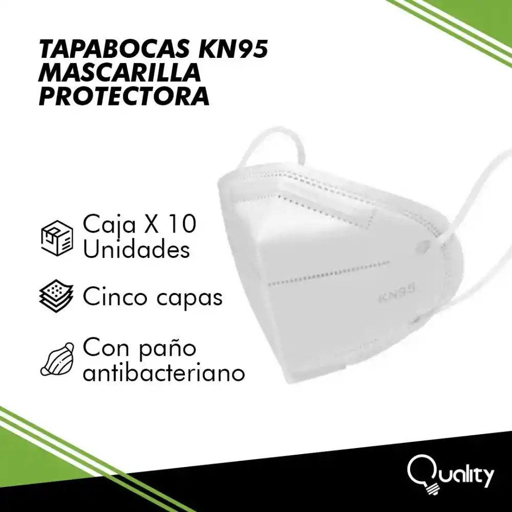 Caja de 10 tapabocas. Su forma plegable, el diseño de sus bandas elásticas, y el clip de aluminio para el ajuste a la nariz aseguran un excelente sello adaptándose a un amplio rango de tamaños de cara. Material de 5 capas, tela antibacteriana fundido por soplado de doble capa.