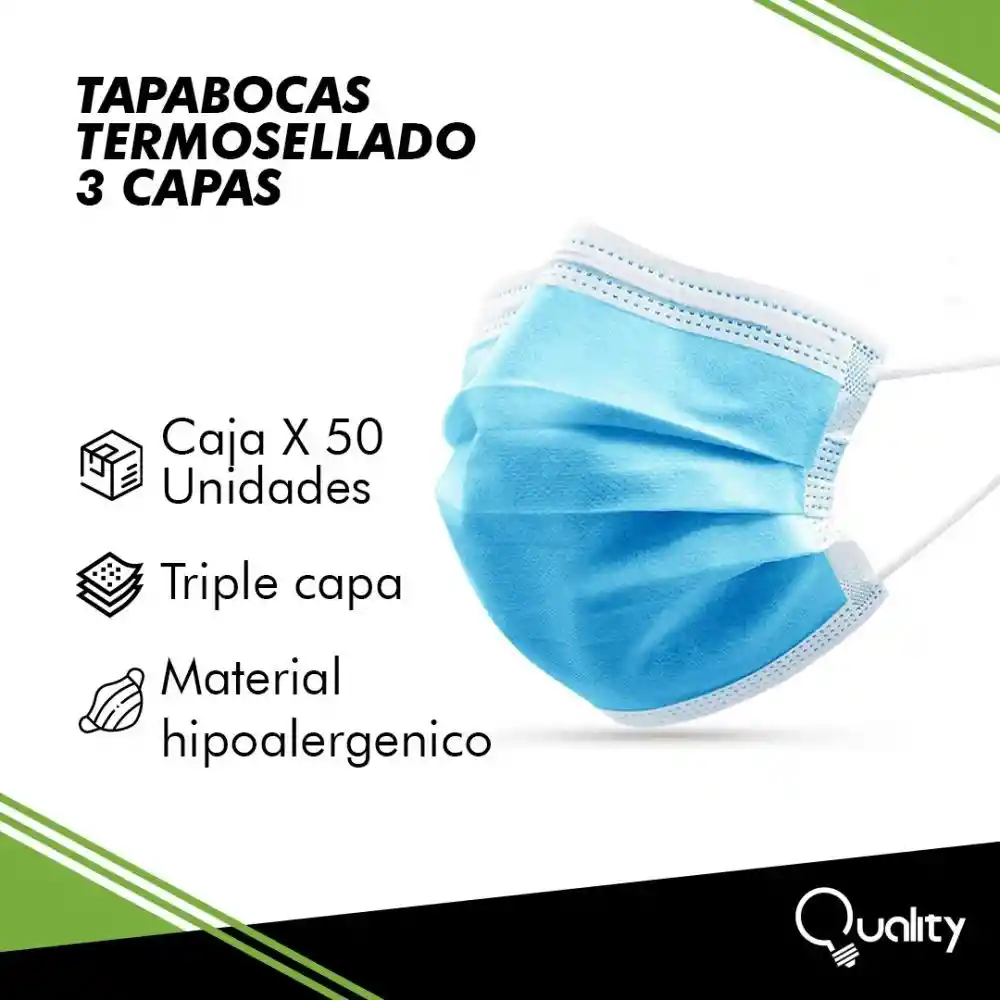 Caja de 50 tapabocas, con triple capa, elaborados con materiales 100% hipoalergénicos.