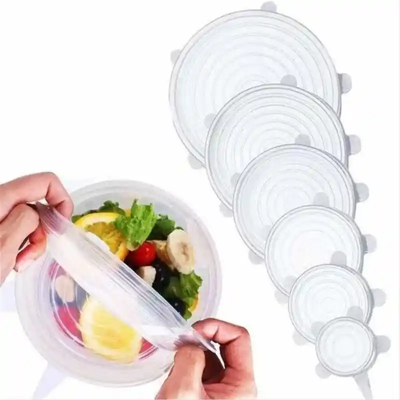Tapas en silicona que se ajustan a diferentes tipos de recipientes. Incluye 6 tapas de diametros 7 cm, 10 cm, 12 cm, 15cm, 17cm y 20 cm. Son reutilizables.