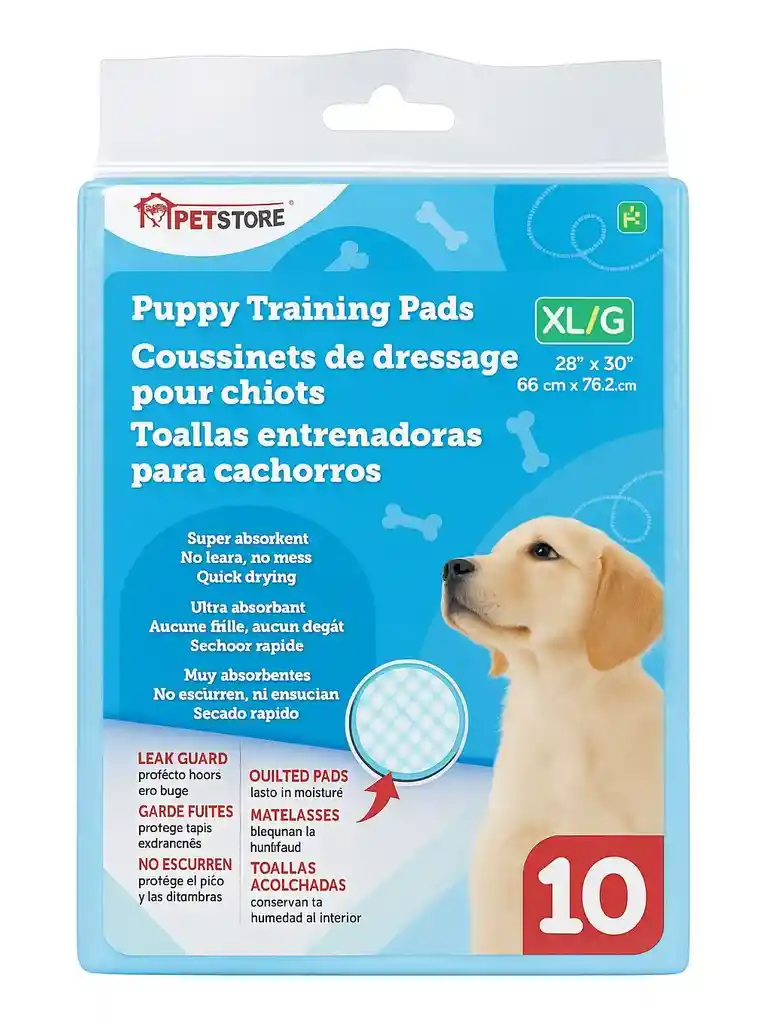 🐶 Pads Entrenadores para Cachorros PETSTORE – XL/G (10 unidades) Mantén tu hogar limpio y libre de accidentes mientras entrenas a tu cachorro con los pads súper absorbentes de PETSTORE. Este paquete incluye: 🧼 10 unidades tamaño XL/G (28" x 30" / 66 cm x 76.2 cm), ideales para razas medianas y grandes. 💧 Tecnología de absorción rápida con superficie acolchada que retiene líquidos al instante. 🚫 Protección contra fugas gracias a su borde sellado que evita que la humedad se escape. 🌬️ Secado rápido para mayor higiene y comodidad. 🐾 Diseño sin desorden, sin estrés, perfecto para entrenamientos en interiores.