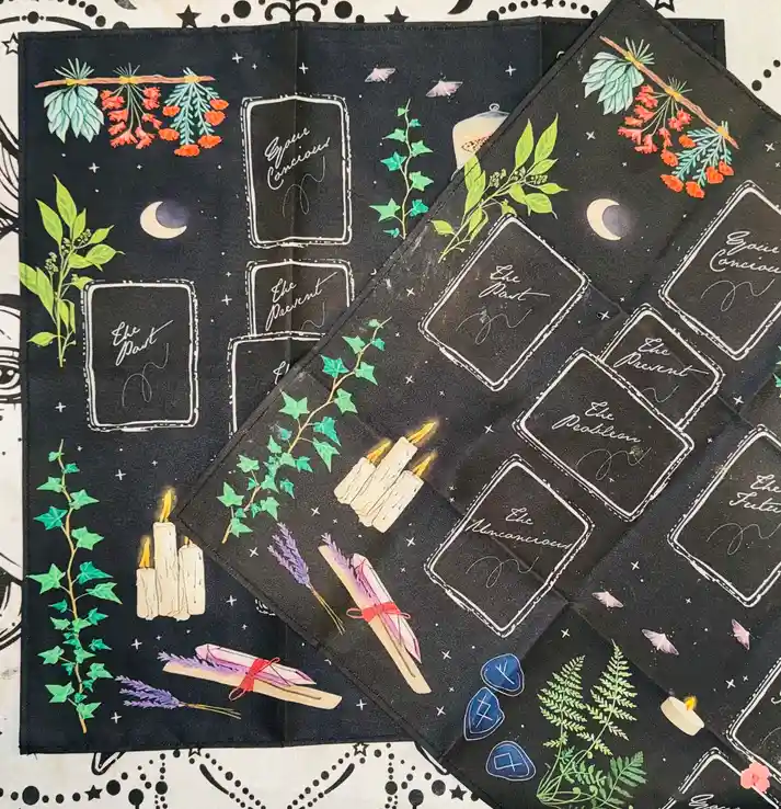 Este tapete místico te acompaña a interpretar el pasado, presente y futuro, integrando también las energías del inconsciente, las influencias externas y los deseos del corazón. Ideal para quienes leen el tarot, el oráculo o las runas, su diseño está lleno de símbolos naturales, velas, cristales y elementos de protección que invitan a conectar con la intuición y abrir portales de claridad. El tapete tiene la guía de posiciones (pasado, presente, futuro, problema, inconsciente, consciente, esperanzas, influencias y resultado). Material: tela resistente, perfecta para altar o lectura ritual. Tamaño: 50cm x 50cm Uso: lecturas personales, sesiones mágicas o decoración energética para tu altar.