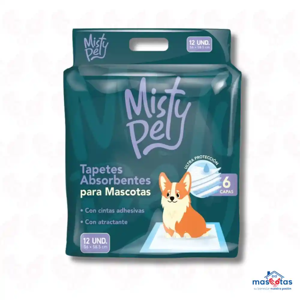 Los tapetes absorbentes Misty Pet son pañales desechables de entrenamiento de alta calidad, diseñados con 6 capas de protección para asegurar máxima absorción y control de olores. Con un tamaño estándar de 56x58.5 cm, incluyen cintas adhesivas para fijarlos al suelo y un atrayente especial para facilitar el entrenamiento de cachorros o uso de mascotas mayores. Características Principales de los Tapetes Misty Pet: Estructura de 6 capas: Incluye polímero superabsorbente (SAP) y pulpa de pelusa para retener líquidos rápidamente. Atrayente y Control de Olor: Ayuda a entrenar a la mascota y neutraliza malos olores para un ambiente limpio. Fijación Segura: Cuenta con cintas adhesivas en las esquinas para evitar deslizamientos o derrames. Superficie Seca: Capa superior suave no tejida (spunbond) que mantiene la humedad lejos de la piel. Dimensiones: Cada tapete mide aproximadamente 56 cm x 58.5 cm. Presentación: Generalmente vienen en paquetes de 12 unidades. Son ideales para el uso en interiores, entrenamiento de cachorros, mascotas mayores con incontinencia o espacios pequeños.