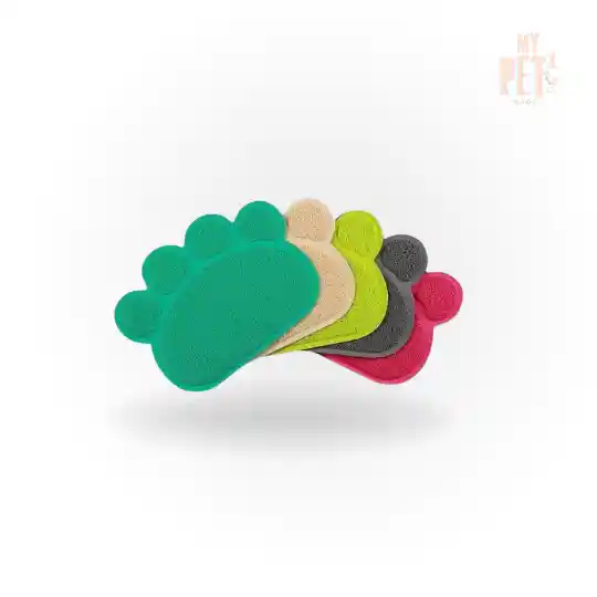 40 × 50 cm aprox. Tapete multifuncional en forma de huellita ideal como trampa de arena para areneras o base antideslizante para platos de comida y agua. Colores surtidos sujetos a disponibilidad.