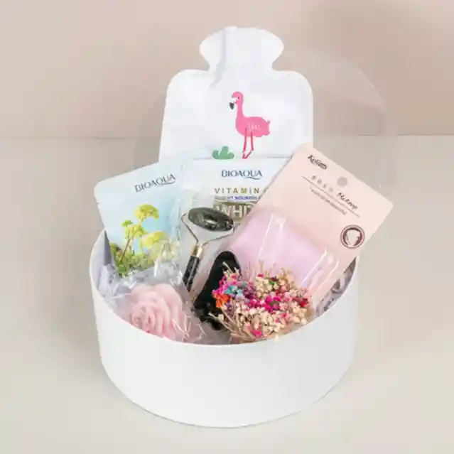 Ud. Arreglo de Gipsolifia de colores. Ud. Balaca para desmaquillarse. Ud. Bolsa térmica para manejo de los cólicos. Ud. Mascarilla para la cara 10g x2. Ud. Rodillo facial tipo Jade. Ud. Vela aromatizada a disposición Caja en cartón duro redonda. Decoración especial (Moño/Tarjeta).