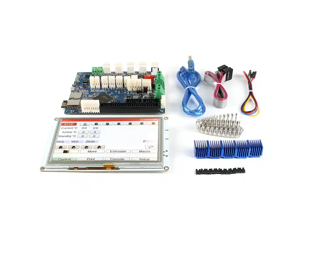<span style="color: #ff0000;">¡NO REALICE NINGUNA OPERACIÓN DE CABLEADO, ESPECIALMENTE EL MOTOR, SIN QUE LA PLACA PRINCIPAL ESTÉ APAGADA!</span> DuetWifi es una electrónica avanzada de 32 bits para el control de impresoras 3D y otras máquinas CNC. Tiene las mismas características que Duet Ethernet, además de proporcionar una conectividad WiFi en lugar de Ethernet, la descripción completa de las características está disponible en nuestro wiki, en resumen: Potente procesador de 32 bits ATSAM4E8E Módulo wifi dedicado Controladores paso a paso TMC2660 súper silenciosos, hasta 256 micropasos. Tarjeta SD de alta velocidad y soporte para una segunda tarjeta externa SD si es necesario. Extrusoras dobles en la placa principal, hasta 5 extrusoras más en la placa de expansión. Clasificación de alta potencia: cada controlador paso a paso es capaz de una corriente de motor de 2.8A, actualmente limitada en el software a 2.4A. El canal del calentador de cama está diseñado específicamente para alta corriente (18 A). Conéctese a través de una PC, tableta o teléfono inteligente en la misma red a la interfaz web incorporada. Configure su impresora y actualice el firmware a través de la interfaz web. Se admiten todas las geometrías comunes de impresoras 3D Ampliable hasta 7 extrusoras con soporte de firmware para mezclar boquillas y reasignar ejes para usar controladores externos de alta potencia. Soporte para PanelDue: una pantalla táctil gráfica a todo color Provisto con enchufes y engarces compatibles con Molex, así como casquillos para terminales de energía y calentador. El PanelDue 5i son controladores de pantalla táctil a color para Duet y otros dispositivos electrónicos de impresión 3D que lo admiten. Esta versión integrada es un panel LCD TFT de 5 pulgadas de alta calidad hecho a medida de un fabricante líder. Características: Resolución de 800 × 480 píxeles en una pantalla LCD de 7 pulgadas. Alimentación de 5 V del controlador de la impresora 3D host. Interfaz serial asíncrona de 2 hilos con nivel de señal de 3.3V (entrada tolerante de 5V). Las conexiones al zócalo de la tarjeta micro SD integrada, así como las conexiones en serie y de alimentación de PanelDue, están disponibles a través de un cable plano de 10 vías. Se suministra un cable plano de 300 mm de largo (longitud máxima recomendada). Cable de 4 hilos para conectar el PanelDue a su placa controladora para las conexiones en serie y de alimentación. Este cable también se suministra (1 m de largo) LA COMPRA INCLUYE: 1X TARJETA CONTROL CLONE TARJETA CONTROL DUET 2 Wifi V1.04 1X DISPLAY 7 PULGADAS 1X CABLE DE 4 PINES 1X CABLE PLANO DE 10 PINES