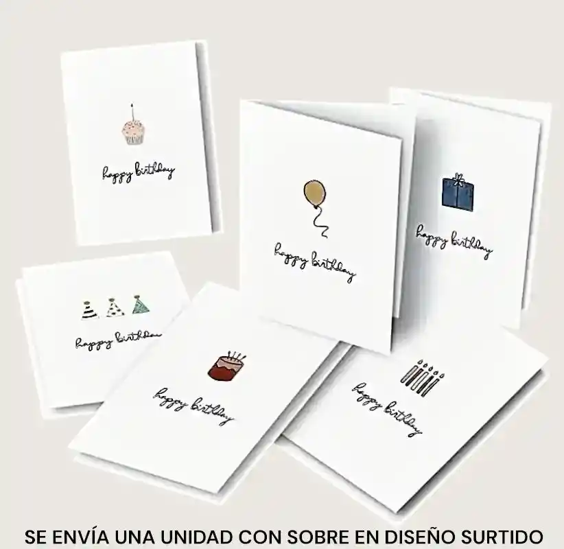Tarjeta de feliz cumpleaños con sobre. MEDIDA TARJETA 9.5x13.5cm APROX MEDIDA SOBRE 10.5X15.3CM. SE ENVIA UNA TARJETA EN DISEÑO SURTIDO CON SOBRE