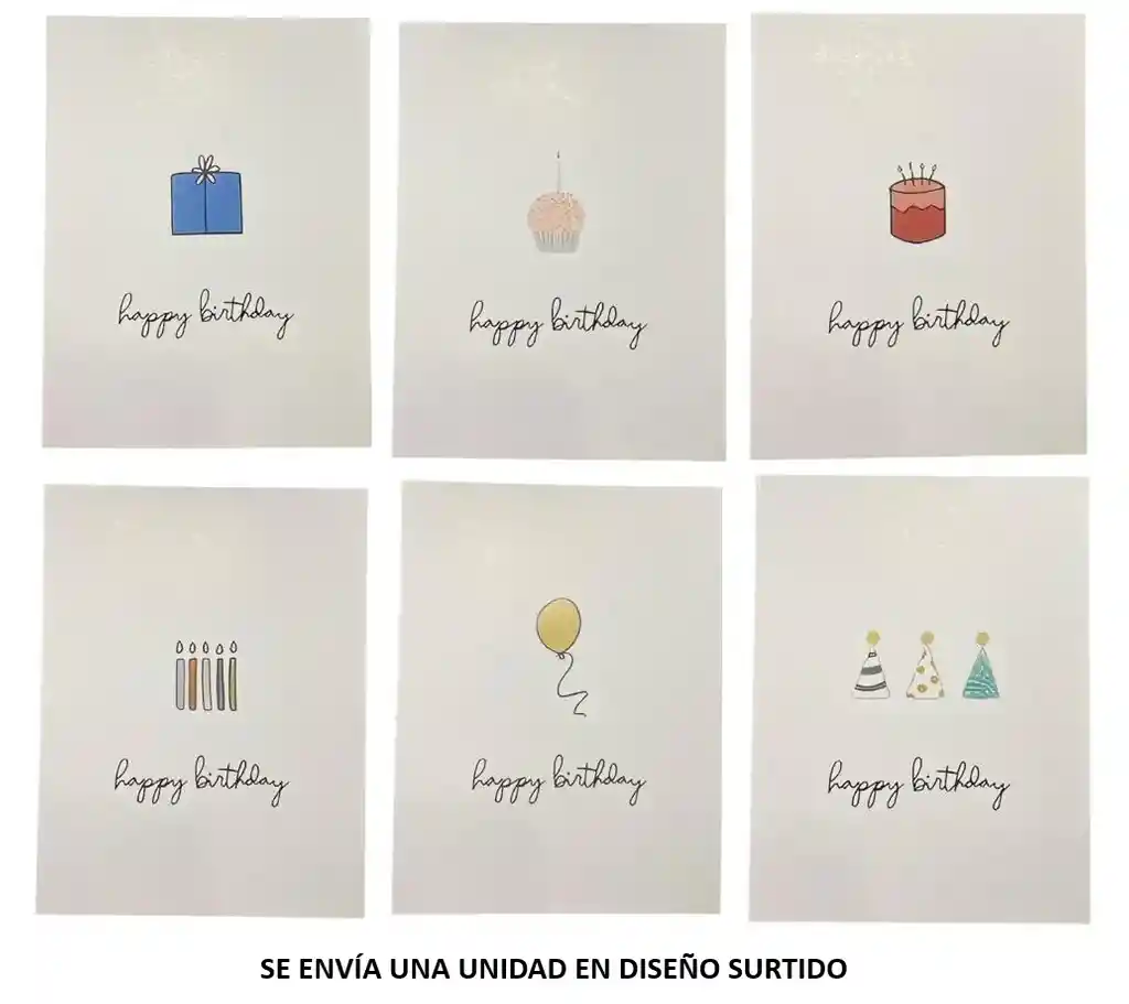 Tarjeta de feliz cumpleaños con sobre. MEDIDA TARJETA 9.5x13.5cm APROX MEDIDA SOBRE 10.5X15.3CM. SE ENVIA UNA TARJETA EN DISEÑO SURTIDO CON SOBRE