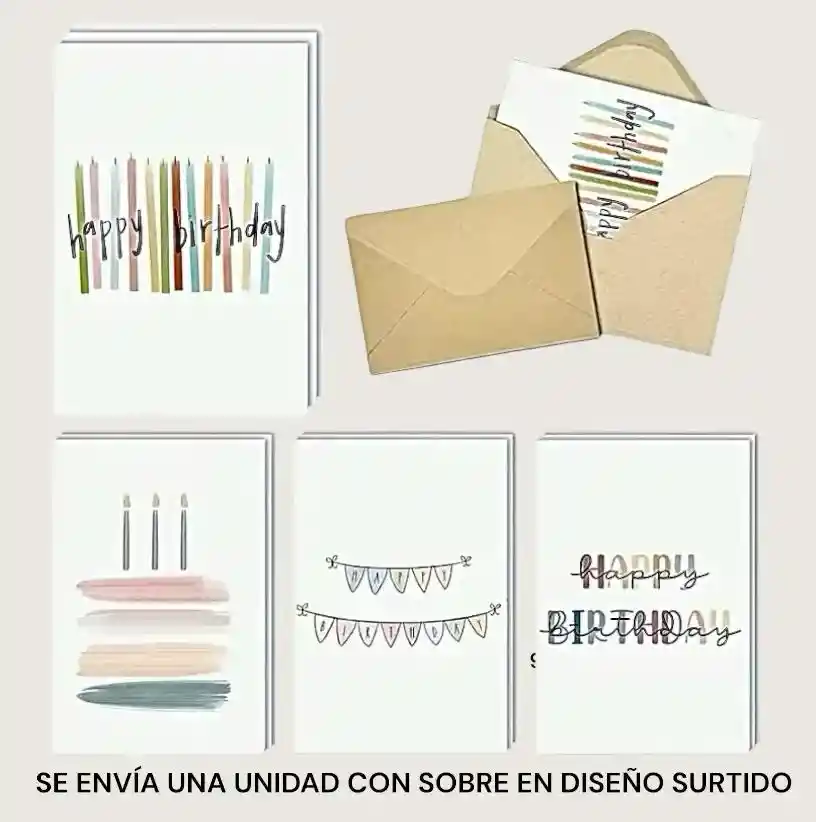 Tarjeta de feliz cumpleaños con sobre. MEDIDA TARJETA 9.5x13.5cm APROX MEDIDA SOBRE 10.5X15.3CM. SE ENVIA UNA TARJETA EN DISEÑO SURTIDO CON SOBRE