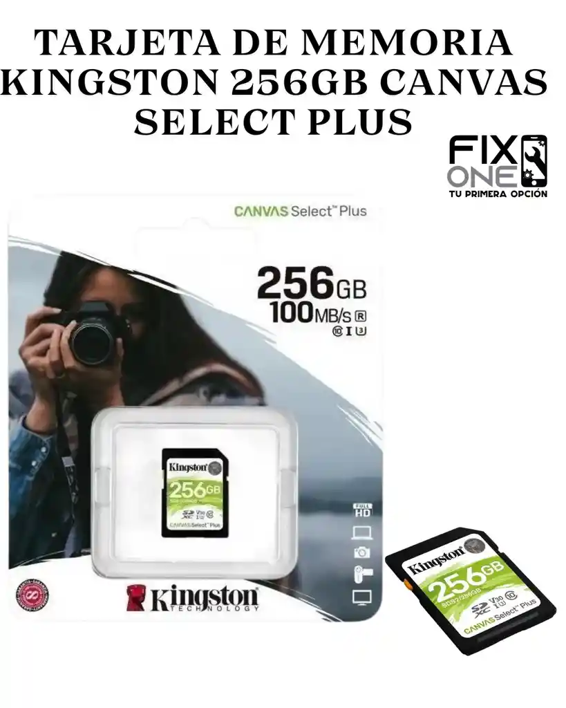 Tarjeta de memoria Kingston 256GB Canvas Select Plus Tarjeta SDXC. Su velocidad de lectura es de 100 MB/s y de escritura 85 MB/s. Su resolución máxima de video es 4K. Almacena diferentes tipos de datos. Clase de velocidad: 10. ✅Nuestros productos antes de ser enviados son probados ✅Imagen de referencia