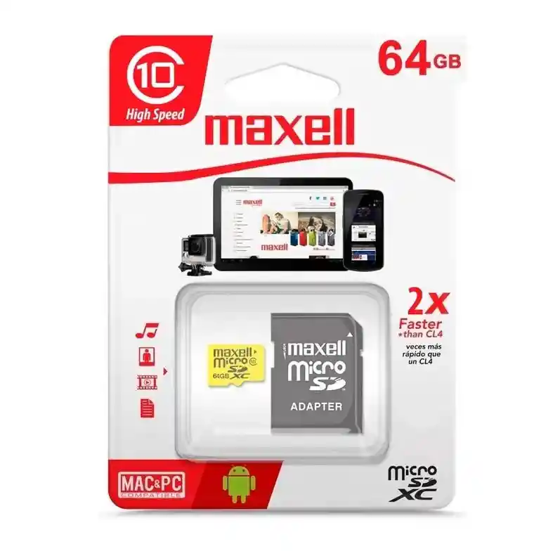 Tarjeta De Memoria Micro Sd 64gb Maxell Clase 10 Original Microsd Maxell MicroSD de 64 GB • Incluye adaptador • 3840 minutos de video • 22.400 fotos aproximadamente • Dos (2) veces más rápida que un CL4