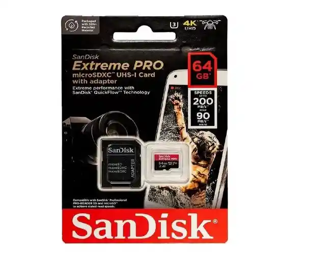 arjeta MicroSDXC. Su velocidad de lectura es de 200 MB/s y de escritura 90 MB/s. Posee adaptador de memoria. Su resolución máxima de video es 4K. Almacena diferentes tipos de datos. Clase de velocidad: 3. Es a prueba de agua.