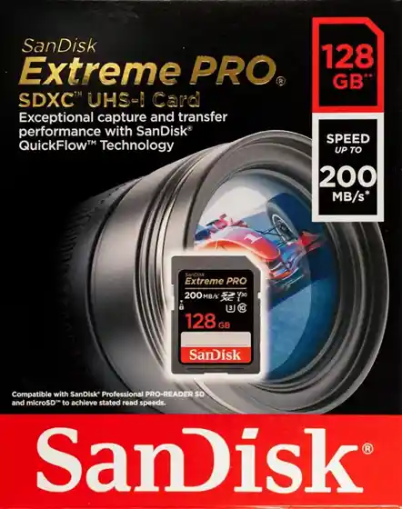 Tarjeta de Memoria SD SanDisk Extreme Pro 128GB 200MB/s Sandisk es sinónimo de rendimiento, calidad y confiabilidad. Esta tarjeta está diseñada con tecnología exclusiva para alcanzar velocidades superiores a los 104MB/s de UHS-1. Velocidad de Escritura de hasta 90MB/s. No solo te permitirá fotografiar momentos, sino que además serás capaz de almacenar y compartir cada experiencia, donde sea que te encuentre la inspiración. Con SanDisk podrás capturar, preservar, acceder y transformar diversidad de datos. Esta tarjeta SDXC se destaca por su gran capacidad de registro de datos, que potencia la velocidad de transferencia y ofrece un uso cómodo y práctico. Resulta ideal para grabar videos de alta resolución y calidad. Máximo rendimiento: Ahorra tiempo gracias a su velocidad clase 10, que posibilita la transferencia de datos de forma rápida y efectiva. Diseñada para dispositivos SD que pueden capturar video Full HD, 3D y 4K, así como fotografías sin procesar y en ráfaga, la tarjeta de memoria Extreme PRO UHS-I SDXC de SanDisk es compatible con el bus UHS-I , y cuenta con una clasificación de clase de velocidad de V30, que garantiza velocidades de escritura mínimas de 30 MB/s. Si su dispositivo no es compatible con el estándar V30, esta tarjeta también es compatible con el estándar U3, que también garantiza velocidades de escritura mínimas de 30 MB/s. Sin embargo se se aconseja utilizar en dispositivos compatibles con esas velocidades, para un óptimo rendimiento. Se admiten velocidades de lectura de hasta 200 MB/s y velocidades de escritura máximas de 90 MB/s. Un interruptor de protección contra escritura incorporado ayuda a proteger contra el borrado accidental de los datos de la tarjeta. Al igual que con la mayoría de las tarjetas SanDisk, esta tarjeta de memoria es a prueba de golpes, rayos X, resistente al agua y, al mismo tiempo, puede soportar temperaturas de -25 °C a 85 °C, lo que le permite llevar esta tarjeta con usted a entornos extremos, como nieve, desiertos y estanques. En caso de que los datos de la tarjeta se vean comprometidos, también se beneficiará de la opción de descargar el software RescuePRO Deluxe. A destacar: Capacidad 128GB Velocidad: 200 MB/s 4K UHD SDXC Clase 10 UHS-I V30 U3 Velocidad máxima de lectura: 200 MB/s Velocidad máxima de escritura: 90 MB/s Velocidad mínima de escritura: 30 MB/s Graba video Full HD, 3D y 4K Interruptor de protección contra escritura incorporado