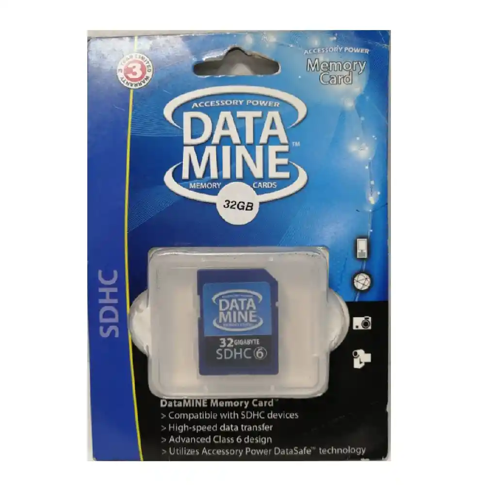 Accessory Power DataMINE Tarjetas de memoria 32GB Las tarjetas de memoria DataMINE SDHC son adecuadas tanto para uso profesional como para consumidores. Las tarjetas DataMINE brindan compatibilidad garantizada para las últimas cámaras digitales, computadoras, reproductores MP3, teléfonos celulares y reproductores multimedia portátiles. El diseño riguroso y los sistemas de control de calidad brindan una tarjeta con velocidades de lectura / escritura avanzadas junto con una base de protección y retención de datos segura. Compatible con dispositivos SDHC Transferencia de datos de alta velocidad Diseño avanzado de clase 6 TM- Utiliza la tecnología Accessory Power DataSafe ™