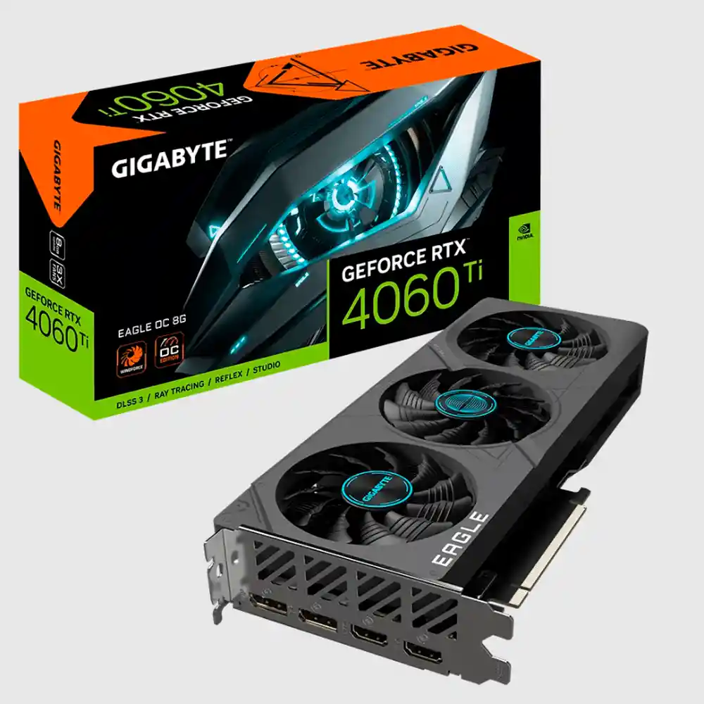 FUERZA DEL VIENTO SISTEMA DE REFRIGERACIÓN El sistema de enfriamiento WINDFORCE cuenta con tres ventiladores de aspas únicos de 80 mm, giro alternativo, 3 tubos de calor compuestos de cobre que tocan directamente la GPU, ventiladores activos 3D y enfriamiento de la pantalla, que en conjunto brindan una disipación de calor de alta eficiencia. Procesamiento de gráficos GeForce RTX™ 4060 Ti (8GB) Reloj central 2550 MHz (Tarjeta de referencia: 2535 MHz) Núcleos CUDA® 4352 Reloj de memoria 18 Gbps Tamaño de la memoria 8 GB Tipo de memoria GDDR6 Bus de memoria de 128 bits Tarjeta Bus PCI-E 4.0 Resolución máxima digital 7680 x 4320 Vista múltiple 4 Tamaño de tarjeta L=272 W=115 H=41 mm Forma de PCB ATX DirectX 12 último OpenGL 4.6 Fuente de alimentación recomendada 500W Conectores de alimentación 8 pines*1 Producción DisplayPort 1.4a*2 HDMI 2.1a*2 Accesorios Guía rápida