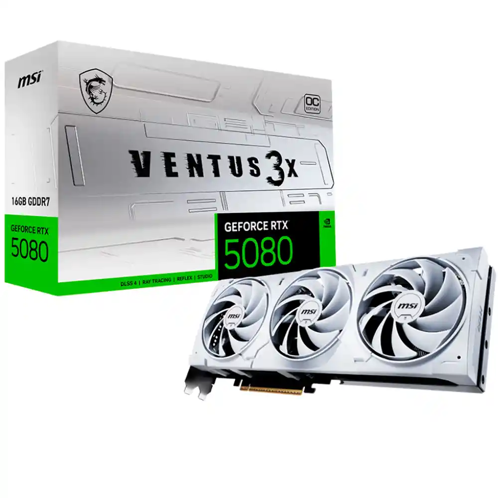 La MSI GeForce RTX 5080 16G VENTUS 3X OC WHITE es una tarjeta gráfica de alto rendimiento con el potente chip NVIDIA RTX 5080, ideal para juegos en 4K/8K y creación de contenido exigente. Cuenta con 10,752 núcleos CUDA, frecuencias de hasta 2655 MHz, y 16 GB de memoria GDDR7 a 30 Gbps. Soporta resoluciones de hasta 8K con salidas DisplayPort 2.1b y HDMI 2.1b, además de tecnología G-SYNC. Su consumo es de 360W, recomendando una fuente de 850W. Incluye un sistema de refrigeración VENTUS 3X y un diseño compacto y elegante en color blanco. Compatible con DirectX 12 Ultimate y OpenGL 4.6. Especificaciones: Nombre de producto: GeForce RTX 5080 16G VENTUS 3X OC WHITE Modelo: G5080-16V3CP Unidad de procesamiento gráfico: NVIDIA GeForce RTX 5080 Interfaz: PCI Express Gen 5 Rendimiento Frecuencia del núcleo: Extreme Performance: 2655 MHz (MSI Center) Boost Clock: 2640 MHz Núcleos CUDA: 10,752 Memoria: 16GB GDDR7 Velocidad de memoria: 30 Gbps Bus de memoria: 256-bit Salidas de video y compatibilidad Salidas: DisplayPort: x3 (v2.1b) HDMI: x1 (HDMI 2.1b, soporta hasta 4K 480Hz o 8K 120Hz con DSC, Gaming VRR, HDR) Compatibilidad con HDCP: Sí Resolución máxima digital: 7680 x 4320 Soporte para múltiples pantallas: Hasta 4 Tecnología G-SYNC: Sí Energía y consumo Consumo energético: 360 W Conectores de alimentación: 1 x 16-pin Fuente de alimentación recomendada: 850 W Dimensiones y peso Dimensiones: 303 x 121 x 49 mm Peso: Tarjeta: 1105 g Paquete: 1618 g Compatibilidad con APIs DirectX: 12 Ultimate OpenGL: 4.6 Garantía: 12 Meses