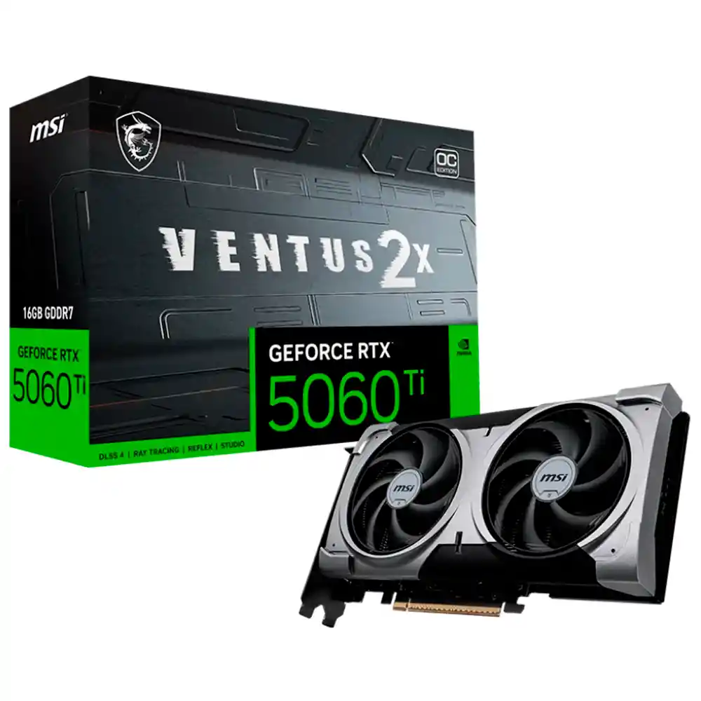 La MSI GeForce RTX 5060 Ti VENTUS 2X OC PLUS combina rendimiento, eficiencia térmica y formato compacto. Con arquitectura NVIDIA Blackwell y DLSS 4, ofrece gráficos fluidos y tiempos de respuesta optimizados en 1080p. Cuenta con 16 GB GDDR6 y frecuencias de hasta 2617 MHz en modo Extreme Performance. Su sistema de enfriamiento STORMFORCE incluye ventiladores aerodinámicos y core pipes para disipación eficiente. La backplate metálica refuerza la estructura y mejora el flujo térmico. Compatible con gabinetes SFF, incluye soporte con MSI Center y Afterburner para ajustes y overclocking. Ideal para gamers y creadores que buscan potencia en formato reducido. Especificaciones: Motor Gráfico: NVIDIA GeForce RTX 5060 Ti Memoria: 16 GB GDDR7 Interfaz de memoria: 128 bits Velocidad de memoria: 28 Gbps Velocidad del Núcleo: Modo Extreme Performance: 2617 MHz (vía MSI Center) Modo Boost (Gaming Silent): 2602 MHz Bus: PCI Express Gen 5 (x16 físico, x8 efectivo) Salidas de Video: 3 x DisplayPort 2.1b 1 x HDMI 2.1b (hasta 4K a 480 Hz o 8K a 120 Hz con DSC, compatible con VRR y HDR) Tecnologías de Video: Compatible con NVIDIA G-SYNC Compatible con HDCP Pantallas Soportadas: Máximo de pantallas: 4 Resolución digital máxima: 7680 x 4320 (8K) Consumo y Energía: Consumo máximo: 180 W Fuente de alimentación recomendada: 600 W Conector de alimentación: 1 x 8 pines Compatibilidad de Software: Soporte DirectX: Versión 12 Ultimate Soporte OpenGL: Versión 4.6 Dimensiones: Tarjeta: 227 x 127 x 41 mm Peso: 600 g / 862 g Garantía: 12 Meses