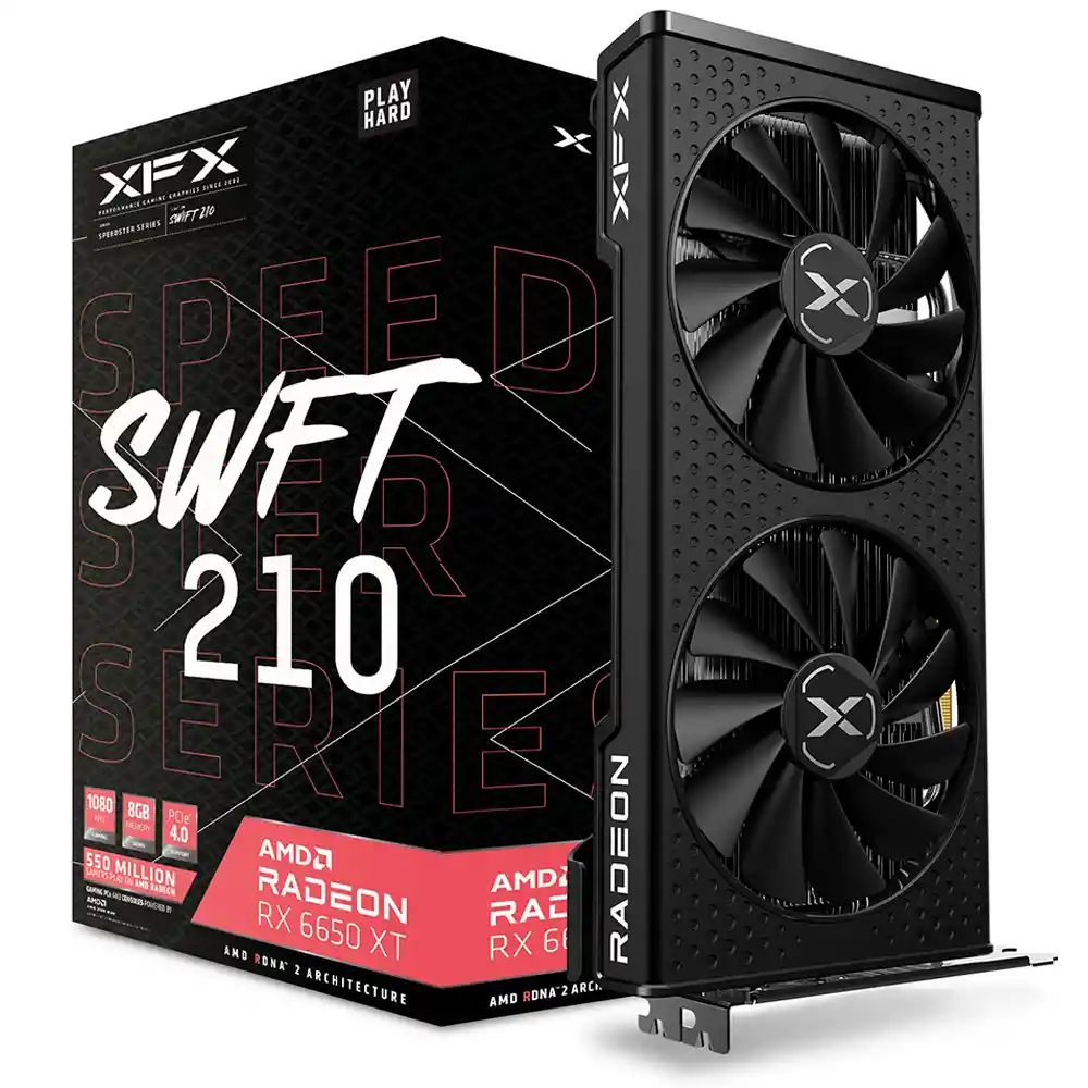 XFX Speedster SWFT 210 AMD Radeon RX 6650 XT RENDIMIENTO POTENTE PARA 1080P Las tarjetas gráficas AMD Radeon RX 6650 XT ofrecen juegos serios de 1080p y velocidades de cuadro ultraaltas. Obtenga hasta 32 unidades informáticas de alto rendimiento, la innovadora AMD Infinity Cache y hasta 8 GB de memoria GDDR6 dedicada. Experimente la próxima generación de rendimiento de juegos con la tecnología AMD Smart Access Memory cuando combina una tarjeta gráfica AMD Radeon RX 6650 XT con un procesador de escritorio AMD Ryzen serie 5000. Especificaciones: Motor Gráfico: AMD Radeon RX 6650 XT Bus Standard: PCI Express 4.0 Memoria de Video: 8GB GDDR6 Reloj base hasta: 2055 MHz Reloj de juego hasta: 2410 MHz Reloj mejorado hasta: 2635 MHz Núcleos CUDA: 2048 Velocidad de Memoria: 17,5 Gb/s Interfaz de memoria: 128 bits Resolución: Máxima digital 7680 x 4320 Interfaz: 3x DisplayPort 1.4 1x HDMI 2.1 Soporte Máximo de Pantalla: 4 Dimensiones: 24,1 x 13,1 x 4,1 cm PSU Recomendada: 550W Conector de energía: 1x 8 pines Garantía: 24 Meses