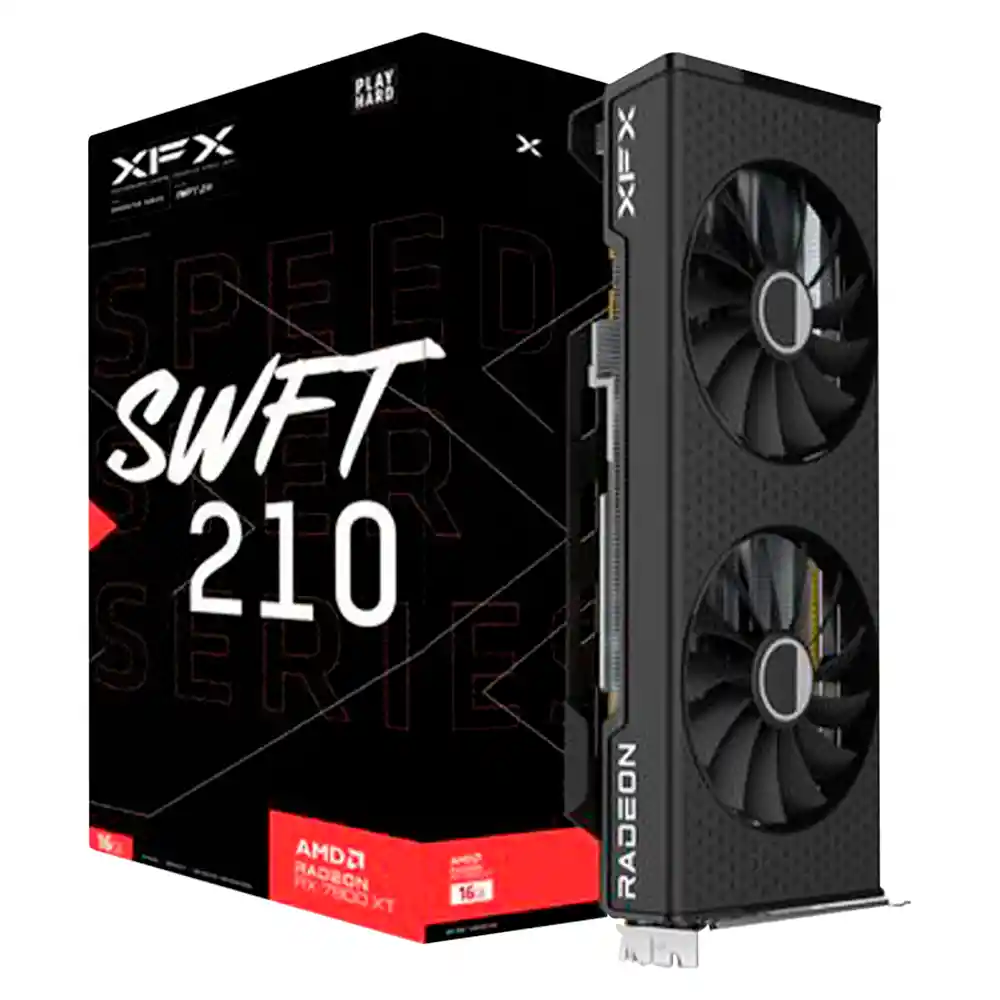 La tarjeta de video XFX Speedster SWFT 210 AMD Radeon RX 7800 XT 16GB está diseñada para ofrecer un rendimiento gráfico excepcional en juegos y creación de contenido. Con arquitectura RDNA™ 3, 16 GB de memoria GDDR6 y un ancho de banda de hasta 624 GB/s, asegura un rendimiento fluido en resoluciones de hasta 4K. Sus características incluyen un reloj base de 1295 MHz, hasta 2430 MHz en modo de refuerzo, y 3840 procesadores de flujo. Además, cuenta con soporte para trazado de rayos, IA, y tecnologías como AMD FreeSync. Su solución térmica de dos ventiladores mantiene las temperaturas controladas. Con puertos DisplayPort 2.1 y HDMI 2.1, es ideal para pantallas de alta resolución. Perfecta para jugadores y creadores de contenido que buscan potencia y calidad. Especificaciones: Modelo: RX-78TSWFTFP Motor Gráfico: AMD Radeon™ RX 7800 XT Velocidades de reloj Reloj base Hasta: 1295 MHz Reloj de juego Hasta: 2124 MHz Reloj de refuerzo Hasta: 2430 MHz Procesadores de flujo: 3840 Unidades de cómputo: 60 Bus de memoria: 256 bits Reloj de memoria: 19,5 Gbps Tamaño de la memoria: 16 GB Ancho de banda de memoria: Hasta 624 GB/s Ancho de banda de memoria efectivo: Hasta 2708 GB/s Tipo de memoria: GDDR6 Perfil de tarjeta: 2,5 ranuras Solución térmica: 2 ventiladores Interfaz de Salida: DisplayPort 2.1 x 3 HDMI 2.1 x 1 Características: Compatibilidad con HDMI™ 4K Descodificación 4K H264 Codificación 4K H264 Descodificación H265/HEVC Codificación H265/HEVC Descodificación AV1 Codificación AV1 Dimensiones: 28,3 x 12,5 x 5,2 cm Fuente de Alimentación Recomendada: 700W Conectores de Energía: 2 x 8 pines Tecnologías inteligentes AMD Aplicación AMD Software: Adrenalin Edition Supresión de ruido AMD AMD Privacy View Tecnología AMD Radeon Super Resolution AMD Link Tecnología AMD Freesync Garantía: 12 Meses