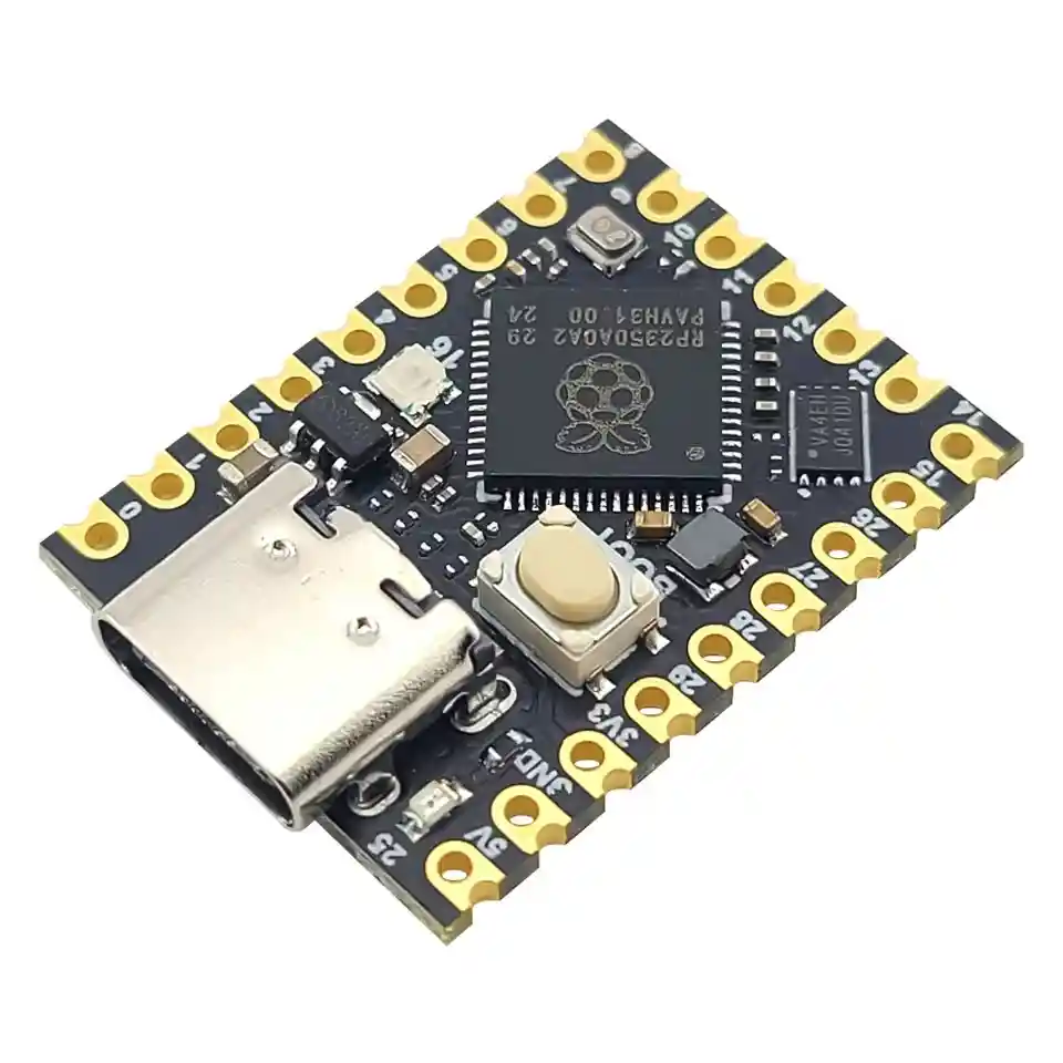La placa de desarrollo Raspberry Pi RP2040 Super Mini es una pequeña y versátil placa basada en el microcontrolador RP2040 de Raspberry Pi. Diseñada para facilitar la creación de proyectos de electrónica y programación, esta placa ofrece un balance ideal entre tamaño y funcionalidad. Con múltiples pines de entrada/salida, interfaces de comunicación y capacidad de programación en lenguajes como C/C++ y MicroPython, es una opción excelente para entusiastas, estudiantes y desarrolladores que buscan un dispositivo compacto para sus proyectos. Microcontrolador: RP2040 Arquitectura: Dual-core ARM Cortex-M0+ Frecuencia de Reloj: Hasta 133 MHz Memoria RAM: 264 KB de SRAM Almacenamiento: 2 MB de Flash integrado incorporados Pines GPIO: 29 pines (20 se pueden fijar a través de cabezales de pines, el resto solo se puede soldar) Interfaces de Comunicación: 2 SPI 2 I2C 2 UART 4 ADC de 12 bits 16 canales PWM controlables Conectividad: USB-C para programación y alimentación Alimentación: 5V a través de USB-C Reloj y temporizador precisos en el chip Sensor de temperatura Biblioteca de punto flotante acelerado en chip LA COMPRA INCLUYE: 1x TARJETA DESARROLLO RP2350 SUPER MINI