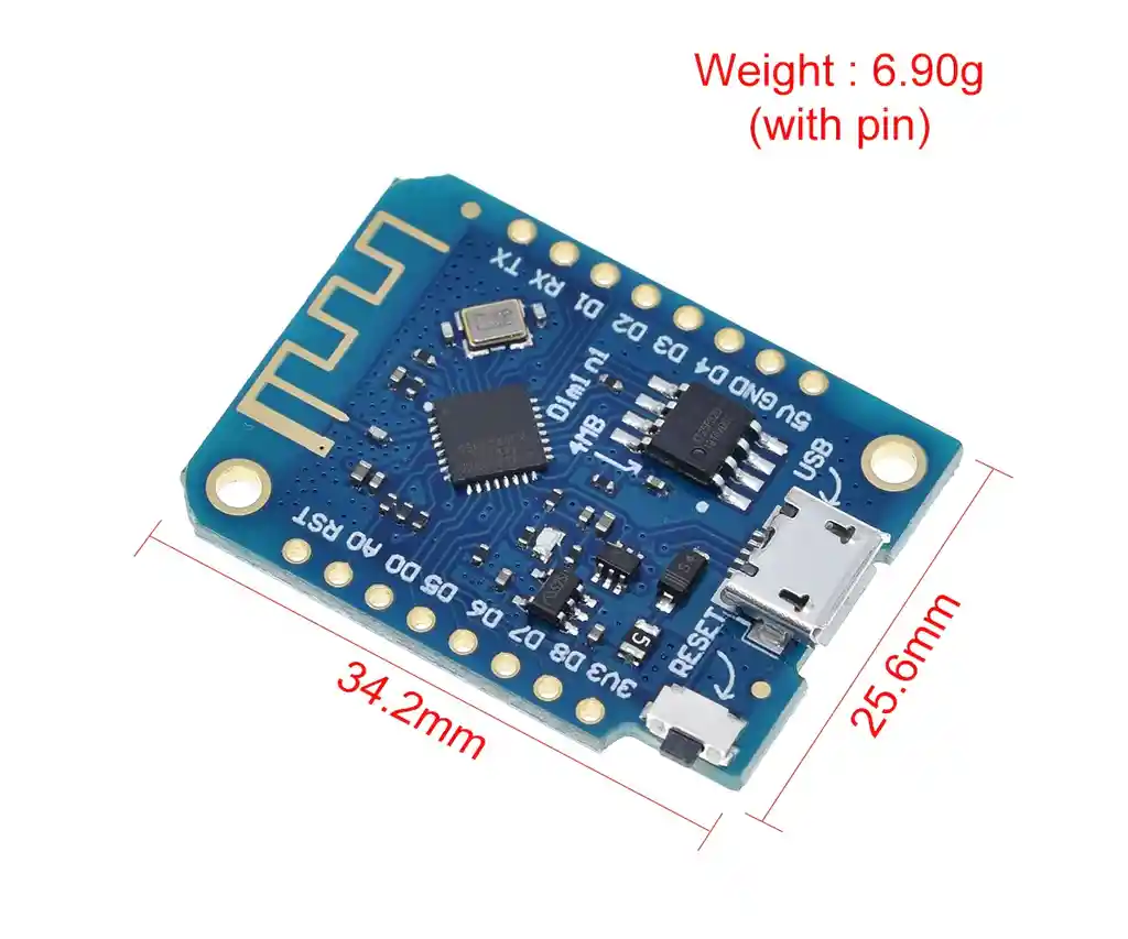 Es una pequeña tarjeta de desarrollo WiFi basada en el ESP8266EX, tiene un procesador de 32 bits y memoria flash de 4MB. Esta pequeña tarjeta es parte de la familia de placas Wemos y a diferencia de sus otras versiones incorpora la antena en la misma PCB y convertidor USB a UART CH340G. Posee un regulador de voltaje de 3.3V en la placa, esto permite alimentar la placa directamente del puerto micro-USB o por los pines 5V y GND. Esta diseñada especialmente al desarrollo de prototipos orientados al Internet de las cosas (IoT) para interconectar sensores y actuadores a internet. Es muy fácil de utilizar, es compatible con Arduino IDE sólo hay que tener instalado las tarjetas de la familia ESP8266 también es compatible con Lua, MicroPython, C/C++, Scratch. Esta diseñado especialmente para trabajar montado en protoboard o ser soldado sobre una placa. Modelo: Wemos D1 Mini V3.0 Color de PCB: Azul Dimensiones: 34mm x 26mm Voltaje de suministro MicroUSB: 5V DC Voltaje de operación: 3.3V Consumo de corriente: >400mA Voltaje de Entradas / Salidas: 3.3V DC (No usar 5V) Numero de Pines Digitales: 11 Pines de entrada / salida digital Pines Analógicos: 1 ADC Interfaces: GPIO, UART, I2C, HSPI, PWM Indicación LED: Pin D4 (GPIO2) Interruptor de encendido MCU: ESP8266EX Chip conversor USB-serial: CH340G Memoria Flash: 4 MB Tasa de baudios: 300-4608000 baudios, por defecto 115200 bps Soporte para comandos AT, servidor en la nube y kits de desarrollo (SDK), actualización de firmware Incluye: 2 Tiras header macho de 8 pines 2 Tiras header hembra de 8 pines Par de conectores hembra 8 pines ESP8266EX: CPU: Tensilica L106 32-bit Frecuencia de reloj: 80 MHz (hasta 160 MHz) Rango de frecuencia: 2.4GHz – 2.5GHz (2412M-2484M) Potencia de salida en modo 802.11b: + 20dBm Modos WiFi: Cliente, Soft AP, Cliente + Soft AP (estación, softAP, estación + softAP) Seguridad: WPA-PSK, WPA2-PSK Cifrado: WEP, TKIP, AES Protocolos WiFi: 802.11 b / g / n LA COMPRA INCLUYE: 1x WEMOS D1 MINI V3.0 2x REGLEGA HEMBRA LARGA 2x REGLETA HEMBRA CORTA 2x REGLETA MACHO MACHO
