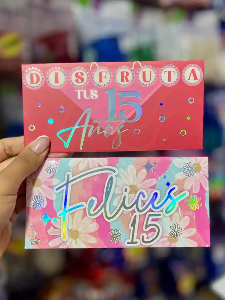 Tarjeta Lluvia De Sobres QUINCE AÑOS 15´S Los diseños pueden llegar iguales o diferentes a los mostrados en la foto, según disponibilidad. Siempre se enviarán tarjetas con la misma temática y estilo. Perfectas para acompañar tus regalos de una forma bonita y especial