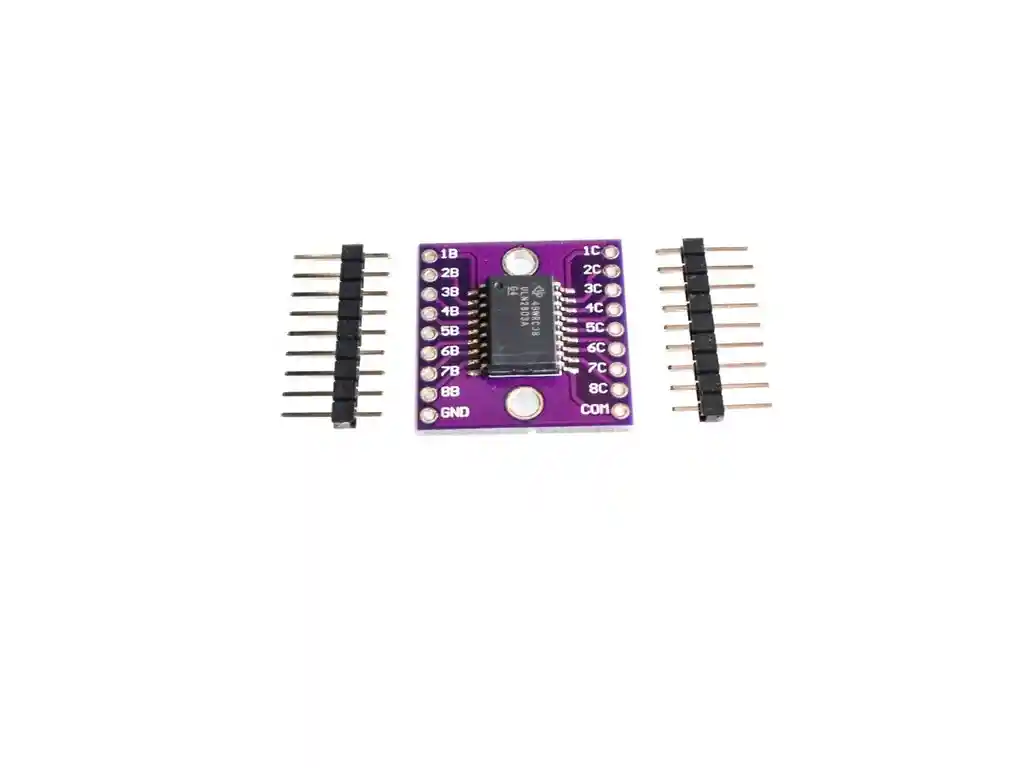 El dispositivo ULN2803A es una matriz de transistores Darlington de 50 V y 500 mA. El dispositivo consta de ocho pares NPN Darlington, que tienen una salida de alto voltaje y un diodo de abrazadera de cátodo común para conmutar cargas inductivas. La corriente nominal del colector de cada par Darlington es de 500 ma. Los pares Darlington se pueden conectar en paralelo para aumentar la capacidad de corriente. Las aplicaciones incluyen controladores de relé, controladores de martillo eléctrico, controladores de lámparas, controladores de pantalla (LED y descarga de gas), controladores de línea y búfer lógicos. Cada par Darlington del dispositivo ULN2803A tiene una resistencia base en serie de 2.7kohm y puede funcionar directamente con dispositivos TTL o CMOS de 5V. Corriente de colector nominal de 500 mA (salida única) Salida de alto voltaje: 50 V Diodo de abrazadera de salida Entrada compatible con varios tipos de lógica LA COMPRA INCLUYE: 1x MODULO DRIVER ULN2803A